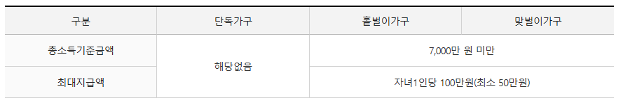 - 소득 요건: 연간 총소득이 가구 유형별 기준 7천만원 이하