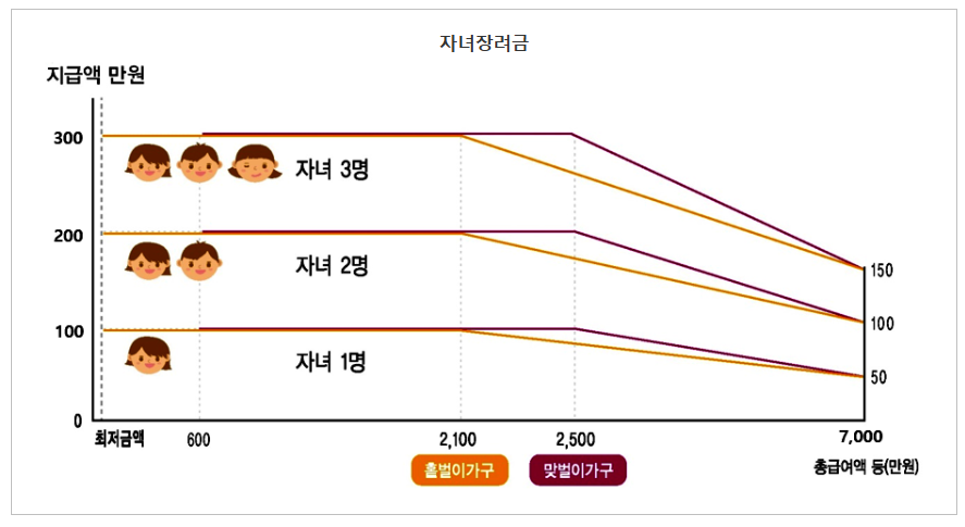 자녀 수에 따라 1명 최대 100만원, 2명은 200만 원, 3명 이상은 300만 원까지 가능해요. 지급액은 총소득·자녀 수·가구 형태에 따라 차등 지급됩니다. 홀벌이가구 기준 2,100만원 이하, 맞벌이 가구 기준 2,500만원 이하여야만 최대 금액인 100만원을 받을 수 있습니다. 아래 그래프를 참고해주세요